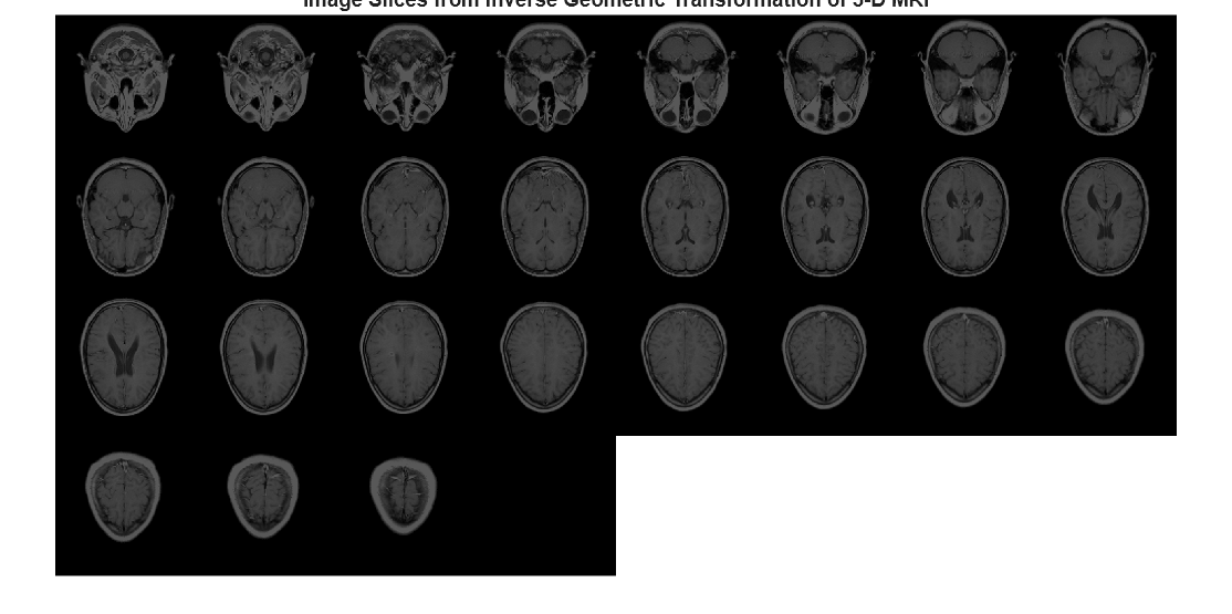 Figure contains an axes object. The hidden axes object with title Image Slices from Inverse Geometric Transformation of 3-D MRI contains an object of type image.