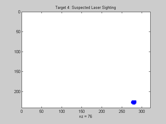 % Target 4... figure(laserFig); hTarget.XData = 1; hTarget.YData = 0; sound(1), pause(2) sound(1), trigger(vid); acqResults{4} = getdata(vid, 1); [xCalib(4), yCalib(4), laserSights] = util_findlaser(acqResults{4}); figure(spyFig); spy(laserSights) title('Target 4: Suspected Laser Sighting')