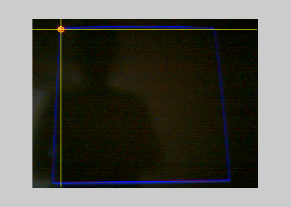 Now that the camera is focused on the right area, a target is drawn at each of the four corners of the box. The calibration is performed by aiming the laser on each corner of the blue square, allowing a relationship to be established between the camera pixel coordinates (the image) and MATLAB axis coordinates (the square). For each target displayed: