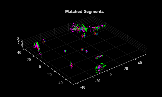 pcshowMatchedFeatures(matchedSegments1,matchedSegments2,matchedFeatures1,matchedFeatures2)