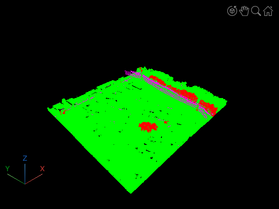 % Set color for each point in point cloud color = repmat([0 1 0],ptCloud.Count,1); % Green color(powerlineIndices,:) = repmat([1 0 1],nnz(powerlineIndices),1); % Magenta color(riskTreeIndices,:) = repmat([1 0 0],nnz(riskTreeIndices),1); % Red pcviewer(ptCloud,color);