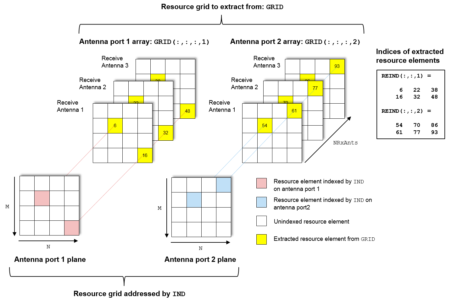 • A 3–D received grid, sized M-by-N-by-NRxAnts. NRxAnts is the number of receive antennas. This grid is created after OFDM or SC-FDMA demodulation.