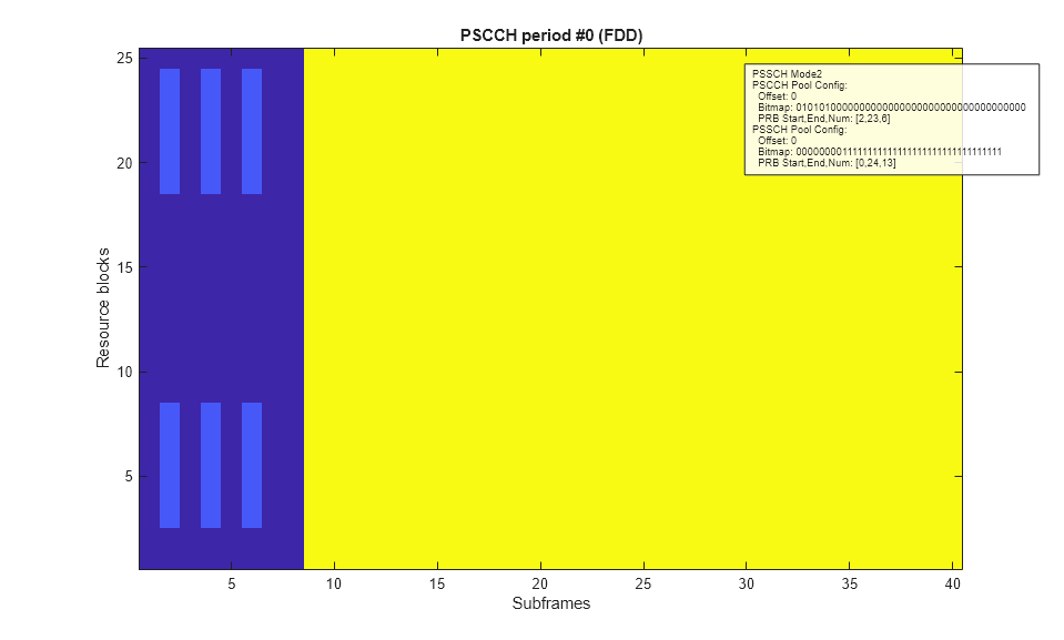 % Create an example PSCCH period and observe the location of the PSCCH % subframe and resource block pools. Note that the PSCCH subframe pool % contains only 2 entries in this case so all of the pool subframes will % be used period = PSCCHPeriod displayPeriod(period); snapnow; % Select a valid nPSCCH value (use the last value in the allowed range) % and return the associated PSCCH subframe and PRB indices dci.PSCCHResource = period.NumPSCCHResource-1; [subframes1,prb1,selected1] = period.getPSCCHResources(dci) % Let the function select an nPSCCH value at random, as required by % the collision avoidance mechanism used in transmission mode 2 sci.PSCCHResource = []; [subframes2,prb2,selected2] = period.getPSCCHResources(sci)