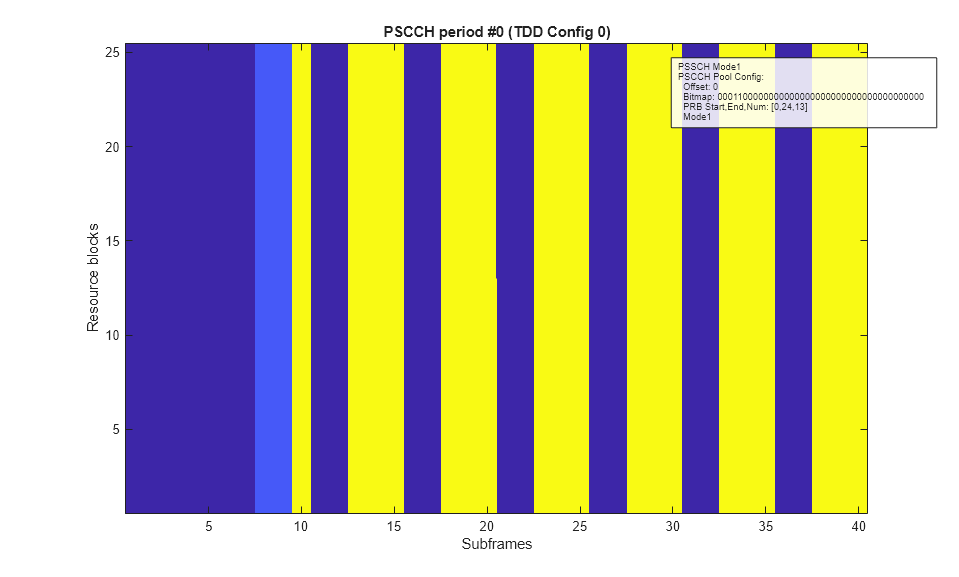 This example uses a MATLAB handle class called PSCCHPeriod to represent the structure of a PSCCH period for a single sidelink direct communications resource pool. Objects of type PSCCHPeriod can be constructed using a parameter structure which combines general transmission parameters, like transmission bandwidth and duplexing mode, with semi-static layer 3 RRC parameters, primarily from the SL-CommResourcePool message (TS 36.331 Section 6.3.8). An object can then be used to,