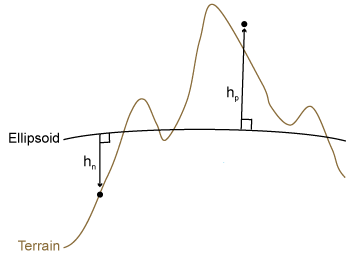 Ellipsoidal height, called h, is height measured along a normal of a reference ellipsoid. For more information about reference ellipsoids, see Comparison of Reference Spheroids. This image shows a positive ellipsoidal height, hp, and a negative ellipsoidal height, hn.
