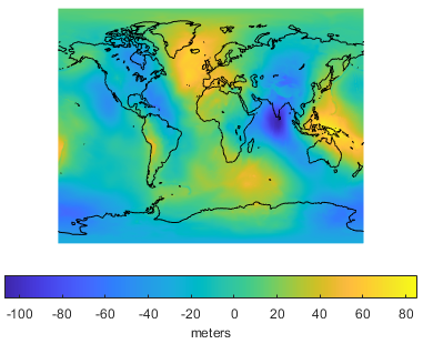 Geoid height, called N, is the height of the geoid measured along a normal of a reference ellipsoid. For example, geoid height values from the Earth Gravitational Model of 1996 (EGM96) are referenced to the ellipsoid defined by the World Geodetic System of 1984 (WGS84). Below is an illustration of the geoid from EGM96, with geoid heights in meters.