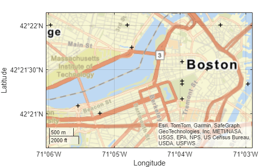 Import a shapefile containing the coordinates of locations in Boston as a geospatial table. The shapefile represents the locations using points. Get information about the points by querying the Shape variable of the table.