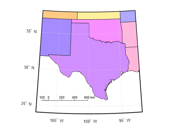 Create a map of Texas and the surrounding states. Your map might look different because the polcmap function randomizes colors.