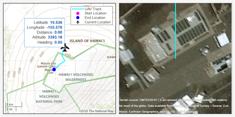 The use of UAVs to track characteristics of changing topology, gasses, and ash clouds around volcanoes is becoming an important area of research for scientists [1]. A UAV can travel in areas of interest (AOIs) that are hazardous for a volcanologist. Simulating the flight path of the UAV prior to sending it out on a mission can assist with understanding the topology and terrain. To gain an overview and 2-D perspective of the AOI, view the locations of the Mauna Loa Baseline Observatory and the Mauna Loa Volcano in a geographic axes.