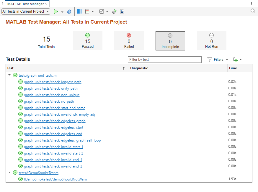 openProject("MATLABShortestPath");Run Tests and View Results