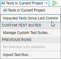 To find impacted tests, open the MATLAB Test Manager. In the drop-down list in the left of the menu, open the test suite for the impacted tests by clicking Impacted Tests Since Last Commit.