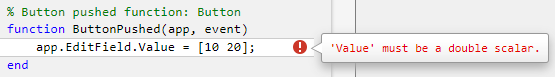 You can also diagnose problems in your code by debugging your app code interactively in App Designer. For more information, see Debug MATLAB Code Files.