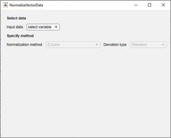 h = 14×1 graphics array: Figure (NormalizeVectorData) GridLayout GridLayout Label (Select data) GridLayout Label (Specify method) GridLayout Label (Input data) DropDown (select variable) Label (Normalization method) DropDown (Z-score) GridLayout Label (Deviation type) DropDown (Standard)