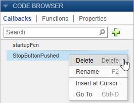 If your code contains a callback function that is not being used by any components in your app, you can delete the function entirely. Delete a callback by right-clicking the callback in the Callbacks tab of the Code Browser and selecting Delete from the context menu.