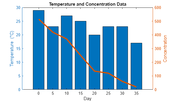 title('Temperature and Concentration Data') xlabel('Day') yyaxis left ylabel('Temperature (\circC)') yyaxis right ylabel('Concentration')