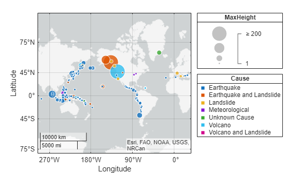 cats = categorical(tsunamis.Cause); cats = fillmissing(cats,"constant","Unknown Cause"); gb.SourceTable.Cause = cats; gb.ColorVariable = "Cause";