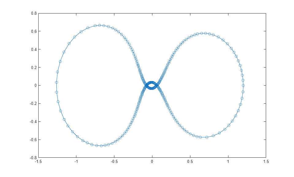 This is an example of event location where the ability to specify the direction of the zero crossing is critical. Both the point of return to the initial point and the point of maximum distance have the same event function value, and the direction of the crossing is used to distinguish them. Calling ODE45 with event functions active... Note that the step sizes used by the integrator are NOT determined by the location of the events, and the events are still located accurately.