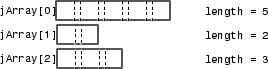 Jagged Java array jArray. Element 0 has a length of 5. The length of the next element is 2 and the length of the third element is 3.