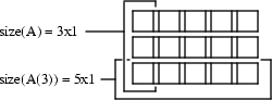 size(A) returns the dimensions of the highest array level of A. The highest level of the array has a size of 3-by-1.