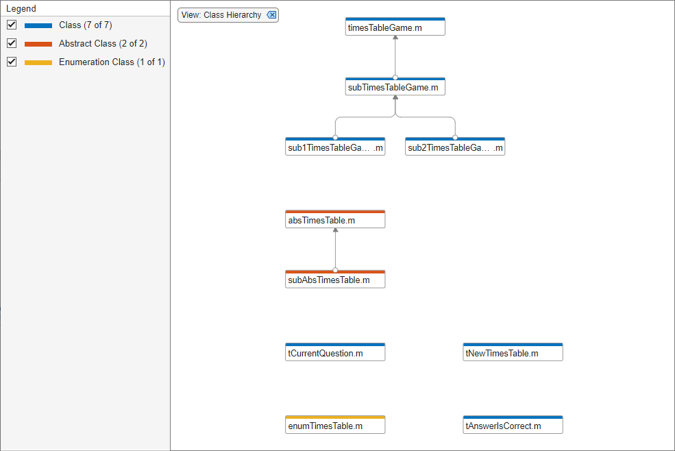 • The Class Hierarchy view shows the class inheritance graph and colors the files by type (class, enumeration class, or abstract class). If the class is not on the search path, the Dependency Analyzer cannot determine the class type.