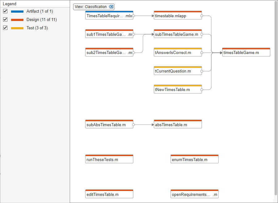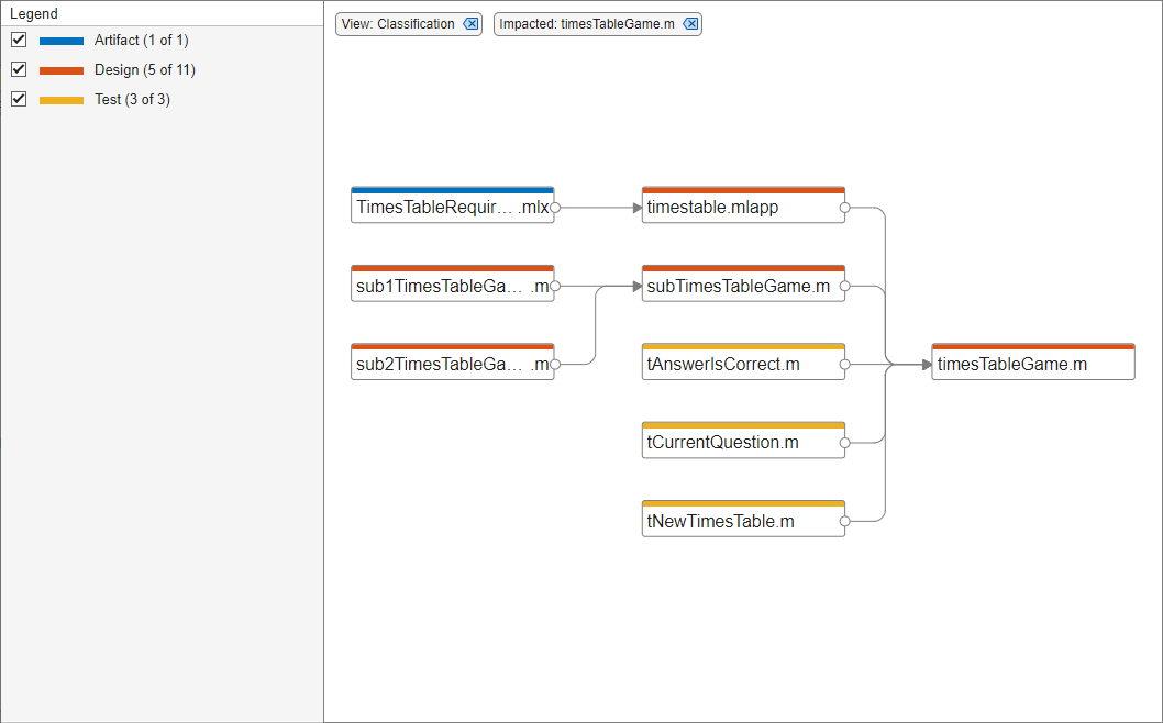 To reset the graph, click the filter at the top of the graph. For example, if you had filtered by files impacted by timestable.mlapp, click .