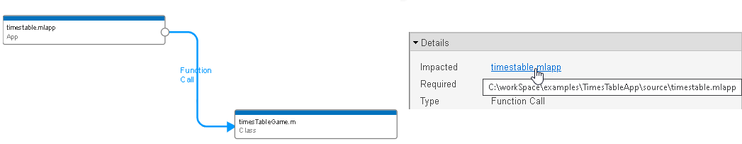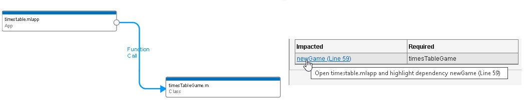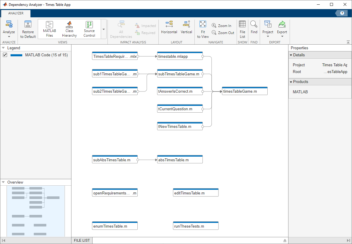 • To show only the dependencies of a specific file, select the file and, in the Impact Analysis section, click All Dependencies. The graph shows the selected file and all its dependencies. To reset the graph to show all project dependencies, remove the filter at the top of the graph. For example, if you filtered by all dependencies of timestable.mlapp, to remove the filter click .