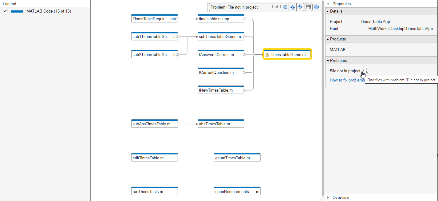 1. In the Properties pane, in the Problems section, point to a problem, such as File not in project, and click the magnifying glass icon . The graph highlights the files with this specific problem.
