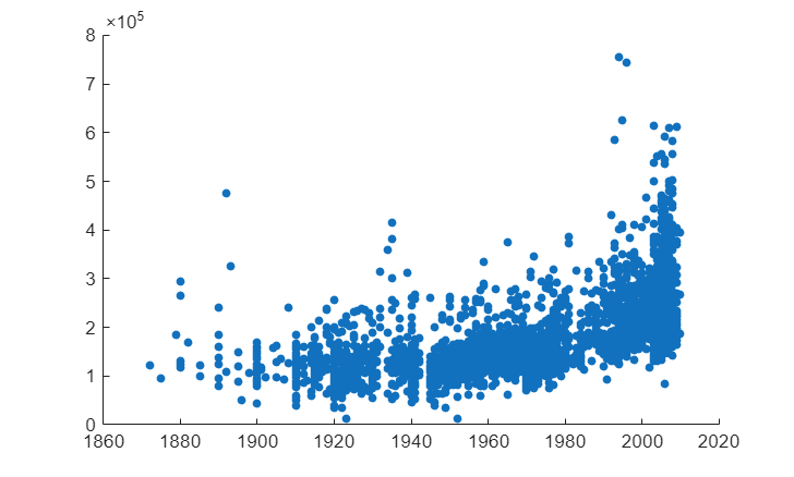 The best way to import a spreadsheet into MATLAB is to use the readtable function, or for data that include timestamps, the readtimetable function. While the Ames Housing Data includes the sale month and year for each house, the month and year are stored in separate columns. In this case, it is simpler to use readtable.