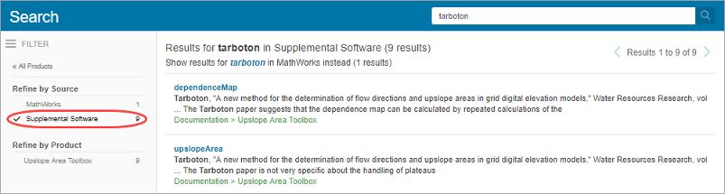 To search for terms in your toolbox, open the MathWorks documentation in your system web browser and in the Search Documentation field, enter the term you want to search for. Then, on the left side of the page, under Refine by Source, select Supplemental Software to view the results for your toolbox.