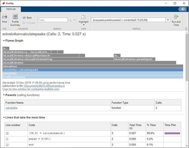 solvelotka.mthat finds the prey and predator population peaks for the Lotka-Volterra example provided with MATLAB:Enter this statement in the edit box to profile thefunction [preypeaks,predatorpeaks] = solvelotka(t0, tfinal, y0) [~,y] = ode23(@lotka,[t0 tfinal],y0); preypeaks = calculatepeaks(y(:,1)); predatorpeaks = calculatepeaks(y(:,2)); end function peaks = calculatepeaks(A) [TF,P] = islocalmax(A); peaks = P(TF); endsolvelotkafunction:[preypeaks,predatorpeaks] = solvelotka(0,15,[20;20])
