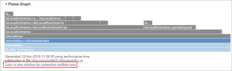 At the top of the Profile Summary results, a flame graph shows a visual representation of the time MATLAB spent running the code. Each function that was run is represented by a bar in the flame graph. User-defined functions display in blue, and MathWorks® functions display in gray.