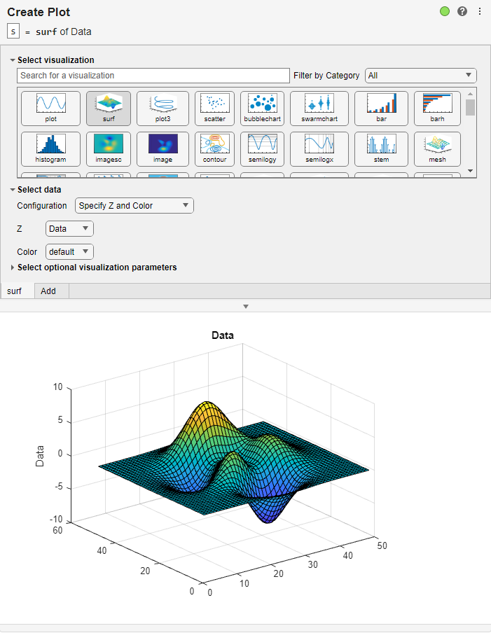 plot,bar, orcontour. Select Create Plot from the suggested command completions. When you add the task using this method, then MATLAB automatically selects the corresponding chart type in the Select visualization section of the task.