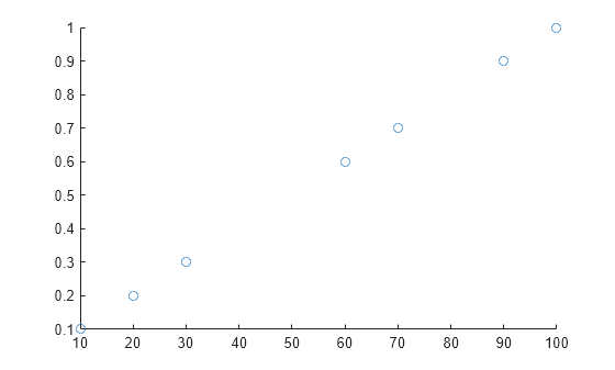 t = 10:10:100; A = [0.1 0.2 0.3 NaN NaN 0.6 0.7 NaN 0.9 1]; scatter(t,A)