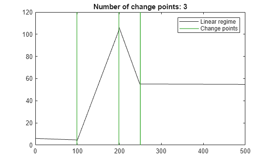 Figure contains an axes object. The axes object with title Number of change points: 3 contains 2 objects of type line. These objects represent Linear regime, Change points.