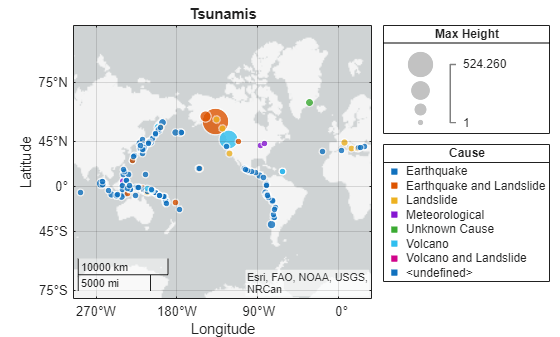 Create a geographic bubble chart from the table. Specify the tsunami locations using the Latitude and Longitude table variables. Specify the sizes of the bubble using the wave heights stored in the MaxHeight table variable. Specify the colors of the bubbles using the categories stored in the Cause table variable. When you create a geographic bubble chart from table data and specify the SizeVariable and ColorVariable arguments, the size and color legends display the names of the associated table variables.