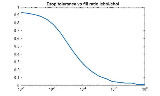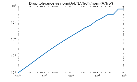 n = size(A,1); ntols = 20; droptol = logspace(-8,0,ntols); nrm = zeros(1,ntols); nz = zeros(1,ntols); nzComplete = nnz(chol(A,'lower')); for k = 1:ntols L = ichol(A,struct('type','ict','droptol',droptol(k))); nz(k) = nnz(L); nrm(k) = norm(A-L*L','fro')./norm(A,'fro'); end figure loglog(droptol,nrm,'LineWidth',2) title('Drop tolerance vs norm(A-L*L'',''fro'')./norm(A,''fro'')')