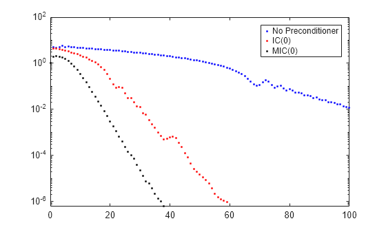 semilogy(0:maxit,rv0./norm(b),'b.'); hold on semilogy(0:it1,rv1./norm(b),'r.'); semilogy(0:it2,rv2./norm(b),'k.'); legend('No Preconditioner','IC(0)','MIC(0)');