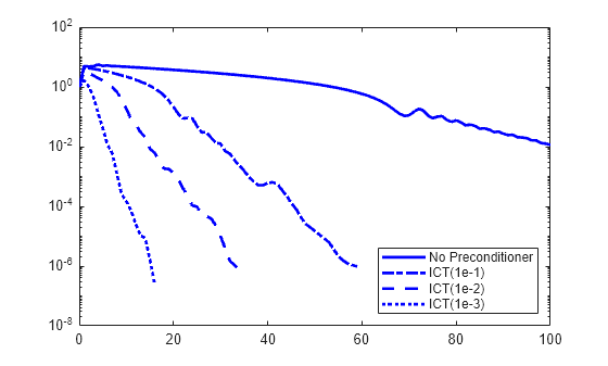 L3 = ichol(A, struct('type','ict','droptol',1e-1)); [x3,fl3,rr3,it3,rv3] = pcg(A,b,tol,maxit,L3,L3'); L4 = ichol(A, struct('type','ict','droptol',1e-2)); [x4,fl4,rr4,it4,rv4] = pcg(A,b,tol,maxit,L4,L4'); L5 = ichol(A, struct('type','ict','droptol',1e-3)); [x5,fl5,rr5,it5,rv5] = pcg(A,b,tol,maxit,L5,L5'); figure semilogy(0:maxit,rv0./norm(b),'b-','linewidth',2); hold on semilogy(0:it3,rv3./norm(b),'b-.','linewidth',2); semilogy(0:it4,rv4./norm(b),'b--','linewidth',2); semilogy(0:it5,rv5./norm(b),'b:','linewidth',2); legend('No Preconditioner','ICT(1e-1)','ICT(1e-2)', ... 'ICT(1e-3)','Location','SouthEast');