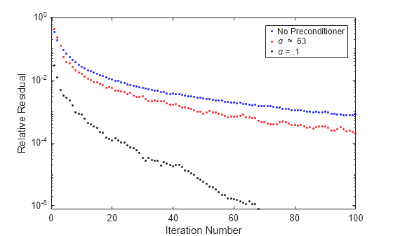 semilogy(0:100,rv0./norm(b),'b.'); hold on; semilogy(0:100,rv1./norm(b),'r.'); semilogy(0:it2,rv2./norm(b),'k.'); legend('No Preconditioner','\alpha \approx 63','\alpha = .1'); xlabel('Iteration Number'); ylabel('Relative Residual');
