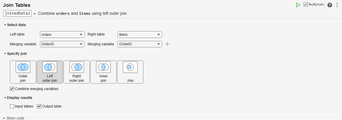 The Join Tables task lets you interactively combine two tables by performing joins or by concatenating the tables horizontally or vertically. The task automatically generates MATLAB® code for your live script.