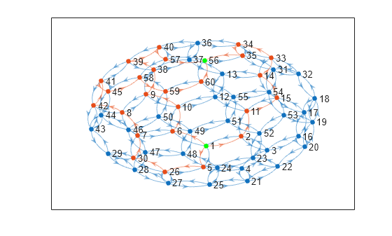 highlight(h,GF,'EdgeColor',[0.9 0.3 0.1],'NodeColor',[0.9 0.3 0.1]) highlight(h,[1 56],'NodeColor','g')