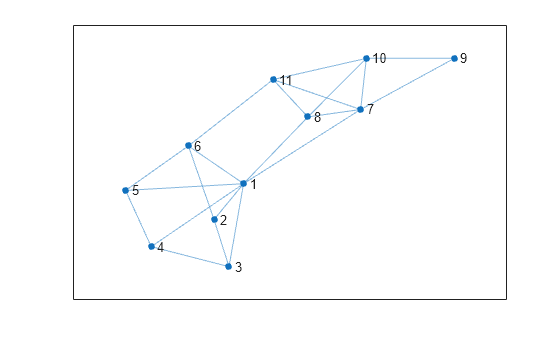 s = [1 1 1 1 1 1 2 3 4 5 6 7 7 7 7 8 9 10 11 8 6]; t = [2 3 4 5 6 7 3 4 5 6 2 8 9 10 11 10 10 11 8 1 11]; G = graph(s,t); h = plot(G)