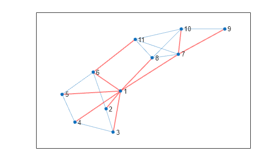 [T,p] = minspantree(G); highlight(h,T,'EdgeColor','r','LineWidth',1.5)