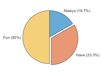 flavors = categorical(["Banana Cream","Pumpkin","Pumpkin","MATLAB","Blackberry"]); flavors = reordercats(flavors,["MATLAB","Pumpkin","Banana Cream","Blackberry"]); piechart(flavors)