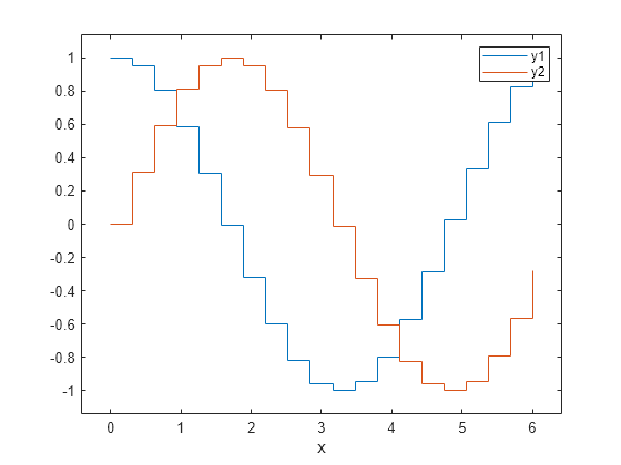 x = linspace(0,6,20); y1 = cos(x); y2 = sin(x); tbl = table(x,y1,y2); stairs(tbl,"x",["y1","y2"]); % Pad x- and y-axes, and add legend axis padded legend
