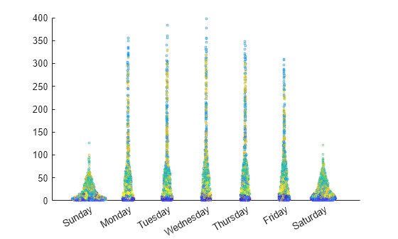 Create a vector x with the day name from each observation, and another vector y with the bicycle traffic observed. Then create a swarm chart of x and y, and specify the point marker ('.'). The chart shows the distribution of bicycle traffic according to the day of the week.