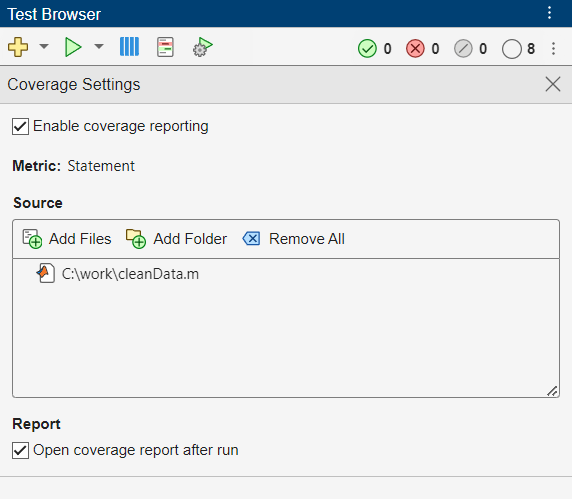 cleanData.mfile.In the Coverage Settings section, under Report, select Open coverage report after run if the check box is clear.