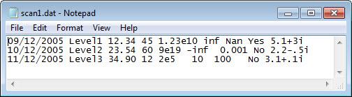 Load file scan1.dat and preview its contents in a text editor. A screen shot is shown below.