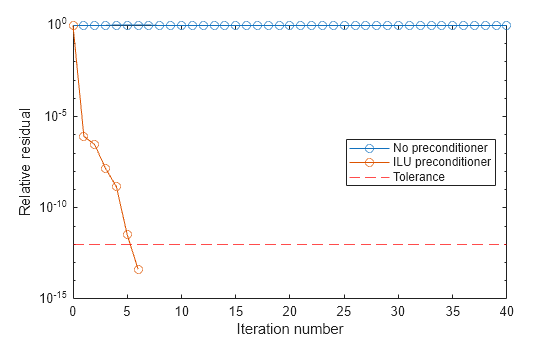 norm(b-A*x)/norm(b) and the iteration number at which the method