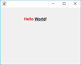 fig = uifigure('Position',[561 497 333 239]); h = uihtml(fig); h.HTMLSource = '<p style="font-family:arial;"><b><span style="color:red;">Hello</span> <u>World</u>!</b></p>';